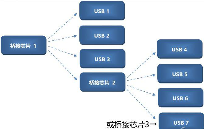 对USB-A型接口而言,它最擅长的工作其实还是用于USBHub,它通过不同数量的桥接芯片,可以转接出4、7、10、13、16或最多20个USB接口。