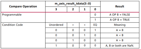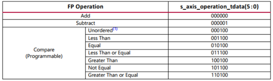 当我们同时选择加法和减法运算或选择可编程比较器时,将存在s_axis_operation通道。s_axis_operation_tdata的具体含义如下表所示。