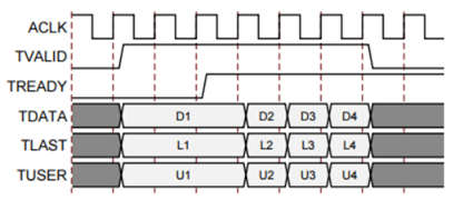 如下图所示,在AXI4-Stream通道中的数据传输。 TVALID由通道的源(主)侧驱动,而TREADY由接收器(从属)驱动。 TVALID指示有效负载字段(TDATA,TUSER和TLAST)中的值有效。 TREADY表示从机已准备好接收数据。当TVALID和TREADY在一个周期中都为TRUE时,将发生传输。主机和从机分别为下一次传输分别设置TVALID和TREADY。