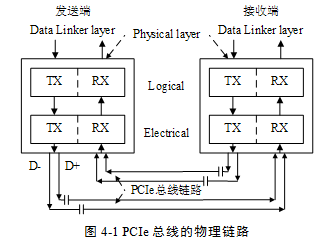 PCIe链路使用“端到端的数据传送方式”,发送端和接收端中都含有TX(发送逻辑)和RX(接收逻辑),其结构如图41所示。