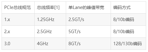 如上表所示,不同的PCIe总线规范使用的总线频率并不相同,其使用的数据编码方式也不相同。PCIe总线V1.x和V2.0规范在物理层中使用8/10b编码,即在PCIe链路上的10 bit中含有8 bit的有效数据;而V3.0规范使用128/130b编码方式,即在PCIe链路上的130 bit中含有128 bit的有效数据。