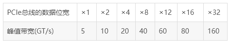 在PCIe总线中,使用GT(Gigatransfer)计算PCIe链路的峰值带宽。GT是在PCIe链路上传递的峰值带宽,其计算公式为总线频率×数据位宽×2。
