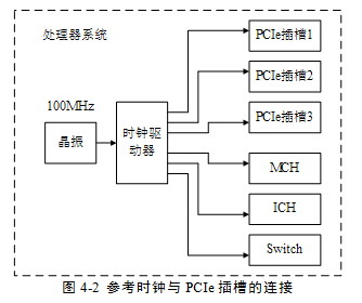 PCIe插槽需要使用参考时钟,其频率范围为100MHz±300ppm。处理器系统需要为每一个PCIe插槽、MCH、ICH和Switch提供参考时钟。而且要求在一个处理器系统中,时钟驱动器产生的参考时钟信号到每一个PCIe插槽(MCH、ICH和Swith)的距离差在15英寸之内。通常信号的传播速度接近光速,约为6英寸/ns,由此可见,不同PCIe插槽间REFCLK+和REFCLK-信号的传送延时差约为2.5ns。