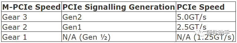 虽然M-PCIe规范允许设备比PCIe PHY消耗更少的功耗,但PCIe提供的速度也高于M-PCIe。一般而言,可以将M-PHY Gear M视为与PCIe Generation (M-1)相同的带宽。
