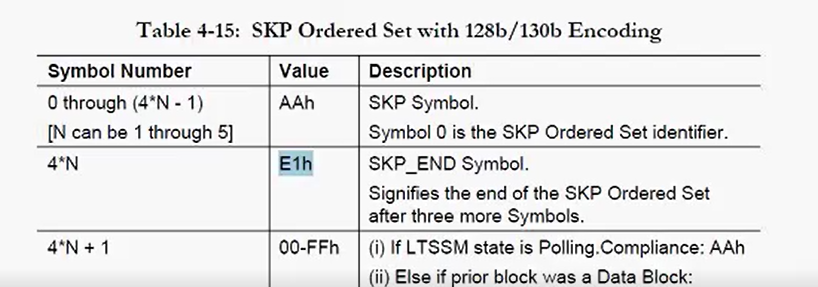 E1 表示 SKP_END 符号的定义详见如下所示的 PCIe 规范。