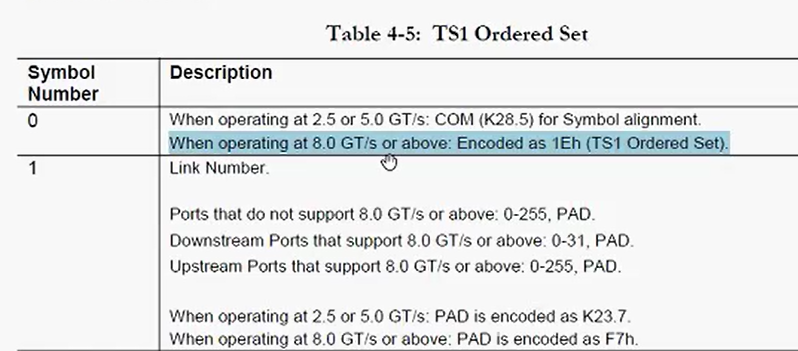0E= 0000_1110。当我们将这些位映射到规范中的 Symbol-4 描述上时,它表示 Gen3 速度得到了支持。