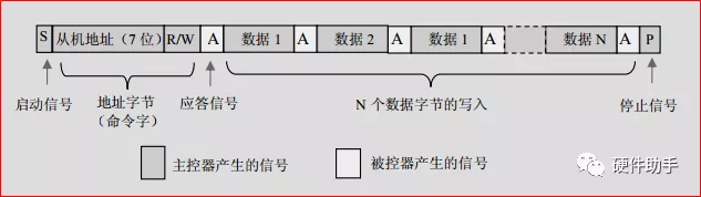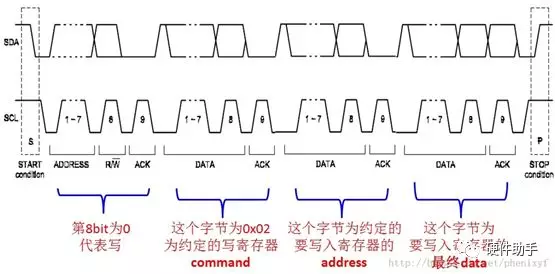 主从器件约定读写指令,在从器件地址后面直接跟读写指令,然后再跟需要读写的寄存器首地址,然后直接跟数据。