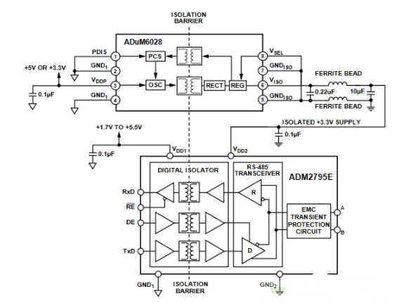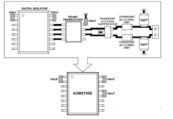 ADM2795E集成化的完整的系统级解决方案可适应各种恶劣环境。大量实验结果和相关案例证明,ADM2795E不仅可以提高RS485/422通讯的可靠性,而且电路也十分简单。