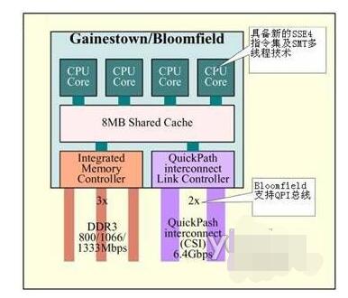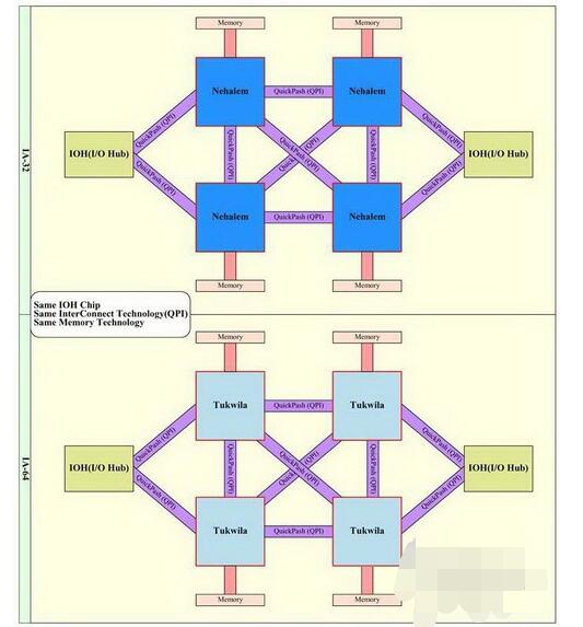 为了降低QPI总线的延迟,Intel打算在4路处理器以上的系统中使用一种叫做粘贴缓存的技术。它主要是倚靠更大容量的二级高速缓存来存储南桥和北桥的数据,使处理器不必反复通过QPI总线来读取南北桥信息。同时,为了更高提升数据处理效率,英特尔还将在处理器内部集成内存控制器(IMC)。QPI和IMC结合,可以让Intel更轻松地扩展多路系统和高性能计算(HPC)应用,而Intel现有的处理器架构更关注于指令执行引擎和缓存架构,以便在单线程应用中提高性能,导致双路服务器平台性能受限,也无法在对内存带宽需求甚高的HPC中发挥作用。对于第一代采用QPI总线的Nehalem Xeon来说,集成了3通道的DDR3内存控制器,这样在搭配DDR3 1066的情况下,每个处理器自己就能得到25.6GB/s的内存带宽,大概是现在Tigerton系统的5倍,并且这个带宽数量随着处理器插座的增长而增长,对于四插座系统,总的带宽将增长到恐怖的102.4GB/s。强大的内存性能将保证即使每个插座上边采用8核心的处理器,内存带宽也不会成为性能发挥的瓶颈。需要说明的是在QPI中,对于四路系统来说,任何两个处理器之间都可以直接通信,这样,一个处理器可以很方便的访问到其他处理器控制的内存,这可以大大提升效率。另外,由于在QPI系统下不同处理器可以直接通信,同步缓存称为很方便的事情,再也不用通过北桥的内存读写来进行了。