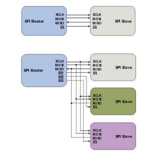(1)SS(SlaveSelect):从设备选择信号线,常称为片选信号线,也称为NSS、CS,以下用NSS表示。当有多个SPI从设备与SPI主机相连时,设备的其它信号线SCK、MOSI及MISO同时并联到相同的SPI总线上,即无论有多少个从设备,都共同只使用这3条总线;而每个从设备都有独立的这一条NSS信号线,本信号线独占主机的一个引脚,即有多少个从设备,就有多少条片选信号线。I2C协议中通过设备地址来寻址、选中总线上的某个设备并与其进行通讯;而SPI协议中没有设备地址,它使用NSS信号线来寻址,当主机要选择从设备时,把该从设备的NSS信号线设置为低电平,该从设备即被选中,即片选有效,接着主机开始与被选中的从设备进行SPI通讯。所以SPI通讯以NSS线置低电平为开始信号,以NSS线被拉高作为结束信号。