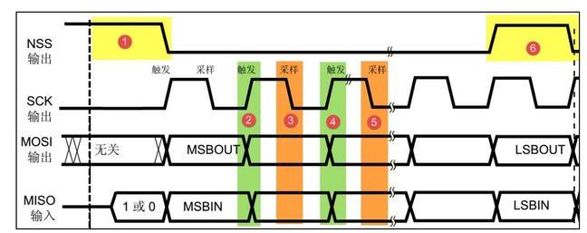这是一个主机的通讯时序。NSS、SCK、MOSI信号都由主机控制产生,而MISO的信号由从机产生,主机通过该信号线读取从机的数据。MOSI与MISO的信号只在NSS为低电平的时候才有效,在SCK的每个时钟周期MOSI和MISO传输一位数据。