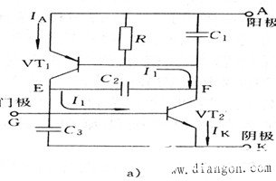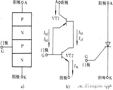 符号和原理如右图所示。SCR有三个极,分别为阳极A阴极K和控制极G(又称门极)从物理结构看,它是一个PNPN器件,其工作原理可以用一个PNP晶体管和一个NPN晶体管的组合来加以说明。SCR有截止和导通两个稳定状态,两种状态的转换可以由导通条件和关断条件来说明。
