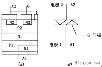 双向晶闸管(TRIAC) 具有公共门极的一对反并联普通晶闸管,其结构和符号见图。图中N2区和P2区的表面被整片金属膜连通,构成双向晶闸管的一个主电极,此电极的引出端子称为主端子,用A2表示;N3区和P2区的一小部分被另一金属膜连通,构成一对反并联主晶闸管的公共门极端,用G表示;P1区和N4区被金属膜连通,构成双向晶闸管的另一个主电极,叫做主端子A1。这样,P1-NI-P2-N2和P2-N1-P1-N4就分别构成了双向晶闸管中一对反并联的晶闸管的主体