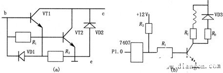 图b是光电耦合器的接口电路,图中的VT1是大功率晶体管,W是步进电动机、接触器等的线圈,VD2 是续流二极管。若无二极管VD2,当 VT1 由导通到截止时,由换路定则可知,电感W的电流不能突然变为0,它将强迫通过晶体管VT1 。由于VT1 处于截止状态,在VT1 两端产生非常大的电压,有可能击穿晶体管。若有续流管VD2,则为W 的电流提供了通路,电流不会强迫流过晶体管,从而保护了晶体管。
