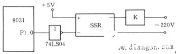 图示出为8031单片机通过固态继电器控制交流接触器的控制线路。当P1.0输出高电平时,固态继电器导通,交流接触器 K 闭合,主电路导通, P1.0为低电平,则主电路关断。