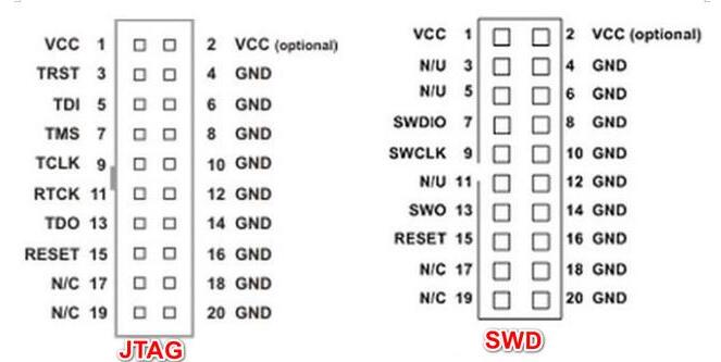 串行调试(SerialWireDebug),应该可以算是一种和JTAG不同的调试模式,使用的调试协议也应该不一样,所以最直接的体现在调试接口上,与JTAG的20个引脚相比,SWD只需要4个(或者5个)引脚,结构简单,但是使用范围没有JTAG广泛,主流调试器上也是后来才加的SWD调试模式。