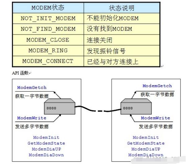 在实际应用中,嵌入式系统和其它控制单元的通信可能不局限于一个小的地理范围,如跨城市通讯甚至跨洲通讯。此时,如果需要布置专门的通讯线路则成本太高,利用现成的通讯网络成为唯一的选择。而电话网络是目前分布最广的廉价通讯网络。不过,要利用电话网络需要一种接口设备,这就是MODEM(调制解调器)。