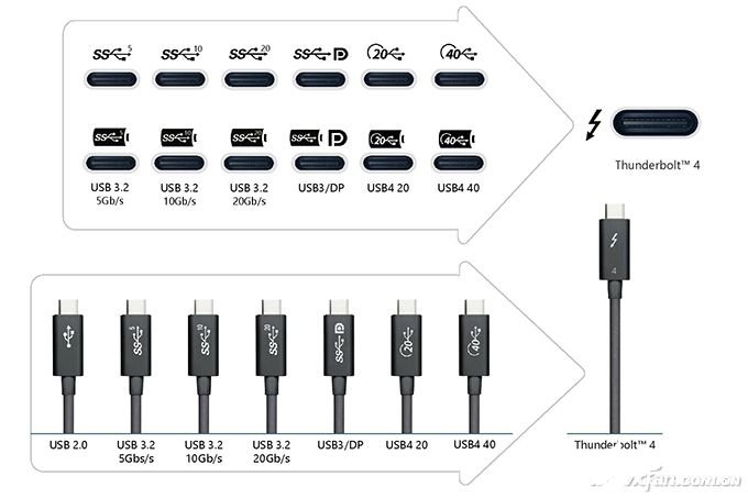 随后,USB4再度来袭,而它也包含半速版本的USB4.0 20(20Gbps)和全速的USB4.0 40(40Gbps),后者又恰好和雷电3的速度相同,很容易让人将它们误以为是同一种接口。