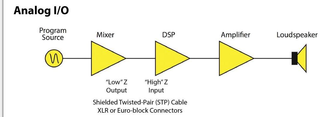 例:100Ω输出能为任何高阻抗的输入(10kΩ,20kΩ,30kΩ,等等)提供同等的信号电平。“输出”连接到“输入”,不考虑其它——就这么简单。通常,可被动分离一路模拟输出以驱动多路输入,但不可合成多路输出以驱动一路输入。