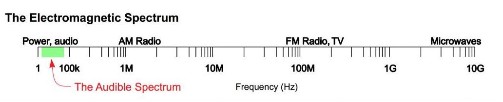 图2:模拟音频(有时又称为基带音频)的频谱含量低于100kHz。相对于整个电磁波谱而言,这是“低”频。