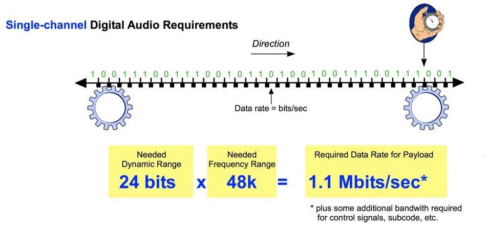 图5:采样率和位深可以用数位流的数据传输速率表示。数位流相当于组成数字信号的“0”和“1”的传输带。AESx数字音频包括两个通道,数据传输速率约为6Mbps。