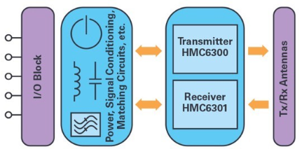 本文介绍了一种采用60 GHz频段,适用于工业滑环应用的新型毫米波数据接口解决方案。该解决方案的关键功能性元件是ADI公司的60 GHz集成式芯片组,由HMC6300 发射器和HMC6301 接收器组成,其原理图分别如图7和图8所示。 这个完整的硅锗(SiGe)收发器解决方案最初针对小型蜂窝回程应用进行了优化,完全可以满足工业滑环应用的数据通信需求。芯片组在57 GHz至64 GHz频率范围内工作,可以使用集成式频率合成器以250 MHz、500 MHz或540 MHz的离散频率阶跃进行调谐,也可以使用外部LO信号进行调谐,以满足目标应用特定的调制、一致性和相位噪声要求。