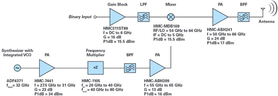 图10.适用于60 GHz发射器的完整信号链解决方案(OOK调制器)