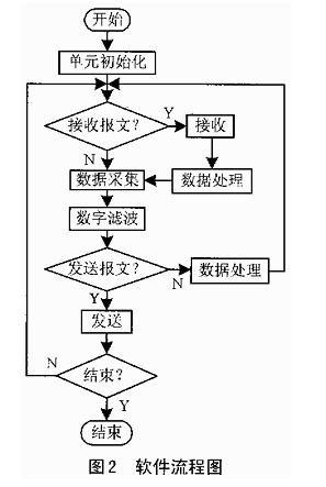 在硬件设计中,由ADC0809完成对8路模拟置的转换,与8051的信息交换采用查询方式,地址BFF8~BFFFH,其时钟可由ALE二分频获得;82527完成与CAN总线的信息交换。本设计中,旁路了输入比较器,与8051的信息交换采用中断方式,地址7F00~7FFFH,可以用82527的P1口和P2口对开关量采集或对继电器进行控制。82C250提供82527和物理总线间的接口,提高接收和发送能力。可根据需要扩展程序存储器。