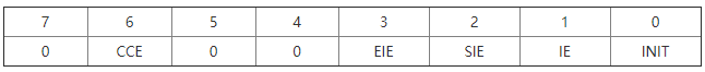 INIT——软件初始化允许位,高电平有效。该位有效时,CAN停止收发报文,TX0和TX1为隐性电平1。在硬件复位和总线关闭时该位被置位。