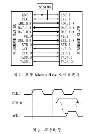 Wishbone 在Master和Slave之间使用的握手协议如图3所示。当准备好传输数据时?Master使STB O信号有效,STB O状态将一直保持到Slave的结束信号ACK O、ERR O 或 RTY O?对Master而言是ACK I?ERR I和RTY I? 之一声明有效。Master在每一个CLK I的上升沿对结束信号采样?如果该信号有效?STB O信号变低。此外,Wishbone接口的两边都能够完全控制数据传送的速率。