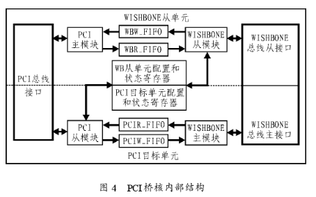 PCI桥核由两个相对独立的单元模块组成:PCI目标单元和Wishbone从单元。每个单元自身都有一套完整的功能来支持Wishbone和PCI总线之间的交易。Wishbone从单元可作为PCI桥中Wish-bone侧的从设备和PCI侧的主设备启动交易;PCI目标单元则可作为PCI桥中PCI侧的目标设备和Wishbone侧的主设备启动交易。两个单元互相独立。PCI目标单元用于实现PCI总线从设备接口和Wishbone总线的主设备接口;而Wishbone从单元则用于实现Wishbone总线从接口和PCI总线的主设备接口。