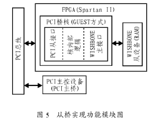 作为从桥时,只需要FPGA板就可以完成整个实验过程。即用Verilog语言实现一个Wishbone从接口,并连接到FPGA内部的BlockRAM上(可由ISE的CORE generator产生),然后选择PCI Bridge核的应用方式为GUEST(从桥方式),并连同自己的程序一起编译下载到FPGA的配置芯片上。这样,把FP-GA板插入PC机的PCI插槽,就可在PC机上开发驱动程序来访问FPGA板上的资源(如RAM等)。如果要进行数据采集,可以把Wishbone从接口连接到数据采集模块上。从桥实现的功能模块图如图5所示。