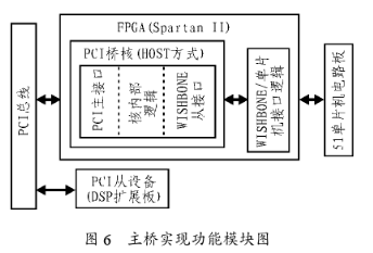 作为主桥时(选择PCI Bridge核的应用方式为HOST),由于FPGA板上没有微控制器,所以需要把FPGA板上的I/O口与51单片机电路板上的I/O扩展口连接起来一起形成PCI主控板。FPGA板和普通PCI扩展板都插到独立的PCI底板的PCI插槽上,然后在FPGA板上和单片机板上进行编程以实现对普通PCI扩展板的初始化配置和正常读写操作。其电路功能模块框图如图6所示。
