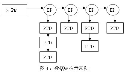 在HCD将PTD从系统内存复制到ATL或ITL缓冲区之前,HCD必须通过集合数据结构来建立和追踪PTD。HCD的责任是追踪所有已连接设备的每个端点的属性,如端点最大封包大小、端点地址和该端点从属的设备地址。另外,HCD必须管理每个端点新的PTD的产生和已经完成的PTD的处理。所以使用一个有效的数据结构体系可以加快主机控制器的操作。本设计实现的数据结构类似于OHCI中定义的数据结构,如图4所示。此数据结构由三部分组成:三种类型端点的队列(控制传输端点、批量传输端点和中断传输端点)、每种端点的一个PTD列和一个完成队列。每个列队由一个全局指针指定,这个全局指针保持队列中第一个端点(EP)队列头的地址。每个EP队列头指向一个PTD列。一个PTD列保留着等待被主机控制器处理的PTD。在控制、批量和中断传输中,PTD被复制到ATL缓冲区。一旦PTD被放入ATL缓冲区,主机控制器就在下一帧中处理该PTD。