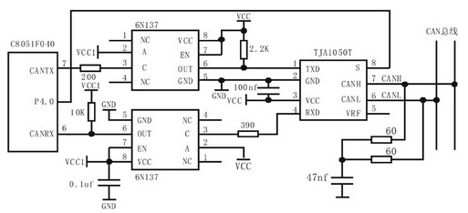 图4是一个以C8051F040为核心的智能节点硬件框图。由于C8051F040集成的是CAN控制器,要使CAN总线得以运行,还需外加CAN总线收发器,常用的CAN总线收发器有Philips公司的PCA82C250收发器、高速TJA1050收发器等。本系统采用了TJA1050高速CAN收发器来替代传统的PCA82C250收发器,TJA1050具有电磁辐射低、防短路、不上电时对总线无影响等特点,它的引脚S可以选择高速或静音两种模式,并可由C8051F040的P4.0控制,CAN总线上两端节点8一般加上两个60W的电阻和47nf的电容对信号吸收,以避免信号反射。为了进一步提高系统的抗干扰能力,在CAN控制器引脚CANTX、CANRX和收发器TJA1050之间并不是直接相连,而是通过由高速光耦6N137构成的隔离电路后再与TJA1050相连,这样就可以很好的实现总线上各节点的电气隔离。这部分增加了节点的复杂性,但它却提高了节点的稳定性和安全性。