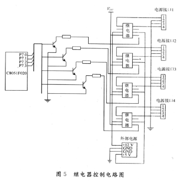本系统中,每台从机上所搭载各硬盘的数据线均与PC机的主板相连。主控机发出指令后,由安装在从机内的控制单元进行接收,并通过控制固态继电器来完成对目标硬盘电源的驱动,从而实现硬盘的选择功能。在无控制信号时,继电器控制端的两端电势相等,电位差为0。当接收到控制信号后,单片机在经过处理后,相应的I/O口产生高电平,引导开关三极管导通,继电器的控制端随即接地,在继电器控制端的两端就产生了大小为Vcc的电位差,继电器的输出端转变为通态,外部电源便可通过电源接口给相应的硬盘供电。其电路图如图5所示。