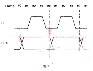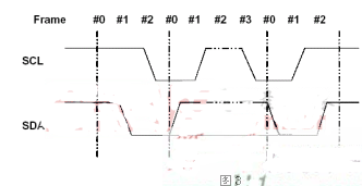 为了进行I2C总线的通讯,我们选用每位数据流4帧(FRAMES),以便延迟和噪声干扰最小,4帧每位的数据流保证了SDA不会变化在SCL的边沿处,仅仅允许数据变化在FRAME0,读仅在FRAME2。如图2所示