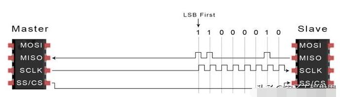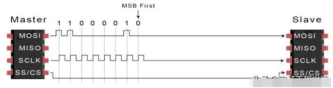 3.主机沿MOSI线一次一位地向从机发送数据。从机在接收到的位时读取这些位: