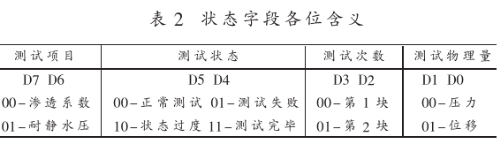 表2中,正常测试表示正在测试,所传送数据有效;测试挫败表示所传送数据无效;状态过度表示正在进行其它操作,所传送数据也无效。数据系列中,两个字节表示一个测试状态下的测试时间,另两个字节表示该测试状态下的测试物理量。