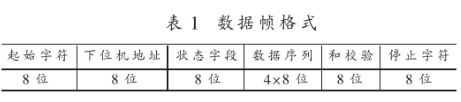通讯协议采用半双工异步通讯方式。数据格式为:1位起始位,8位数据位,1位停止位。帧格式包含呼叫帧和数据帧。呼叫帧由上位机发出,其格式为:起始字符,下位机地址,停止字符等。数据帧是下位机对上位机呼叫的响应,上位机呼叫地址与下位机地址一致时,下位机才发送数据帧,每一时刻只有一台下位机和上位机通讯。数据帧的格式如表1所示。