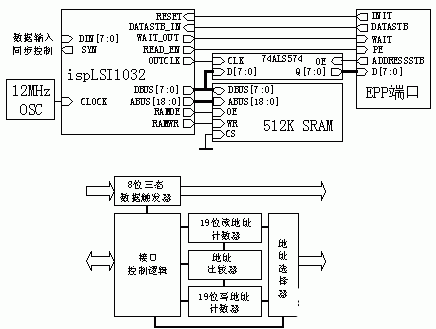 为与微机接口,附加部分其它口线,其中RESET使CPLD全局复位,74ALS574的OE脚由微机控制输出是否为高阻,在程序设定数据端口作为输入使用前,保持该脚为高电平,使74ALS574输出为高阻态,虽然使用的是EPP模式的地址选通信号脚作控制,但程序中并无EPP模式的地址读写指令,此脚的变化直接由EPP端口的控制口(37AH)的D3位控制,另外一般D5位为读写方向控制,将该位置为高,使数据端口作为输入使用。SYN与RAMWR有固定(芯片编程时设定)的相位关系,作为数据采集的同步控制用,当选用MAX114芯片且配置为流水线模式(Pipelined Mode)时,MAX114的WR及RD脚共同连接至SYN脚,此信号波形是与RAMWR同步下降但持续时间为500ns的负脉冲信号,由A/D芯片 MAX114与SRAM及CPLD等器件可构成EPP模式下500ksps的连续数据采集接口。