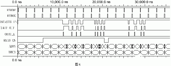 仿真波形参见图4,出于方便,仿真时钟设置为12.5MHz。系统每24个时钟脉冲产生一次数据采集,仿真采样速率521ksps。数据由 DIN[7:0]输入,通过CPLD内部数据输入触发时钟(该时钟同相缓冲后形成RAMOE脉冲,持续宽度为两个系统时钟)的上升沿锁存,并控制地址选择器将写地址输出到ABUS上,在RAMOE为高期间,DBUS开放三态数据触发器输出使能,使被锁存的8位数据经DBUS输出,数据输入触发时钟过后一个系统时钟,RAMWR产生一个系统时钟宽度的负脉冲,控制SRAM将DBUS上的数据写入,再下一个系统时钟的上升沿,RAMWR变高,RAMOE变低使 SRAM输出有效,三态数据触发器恢复为高阻状态,ABUS变为待读数据地址,完成一次数据采集、存储过程。微机软件执行EPP数据读前先读取状态口(379H)以判别READ_EN是否有效,当READ_EN为高时,可以执行EPP数据读周期,CPLD在同步DATASTB_IN的下降沿后,产生一个宽度的OUTCLK输出锁存脉冲,其上升沿将相应待读地址的SRAM数据锁存于外部74ALS574,下降沿使WAIT_OUT上升,形成EPP模式的应答握手信号。WAIT_OUT在DATASTB_IN的上升沿异步复位以响应下一次EPP模式访问。数据写入优先于数据读取,当到达固定的采样间隔点时,CPLD总是推后OUTCLK及WAIT_OUT 的执行,待采样并存储完毕才继续被暂缓的EPP应答,在设计中,数据的采样及存储需要两个系统时钟周期共167ns,远低于EPP的超时参数,故有充分的时间正确地完成EPP握手。图4仿真了数据读空状态,在图中部,READ_EN信号存在一个低电平区域,此负脉冲前,根据RAMWR个数可知当时采样了 11个数据,根据OUTCLK个数可知读取了8个数,剩下3个数不足以提供EPP执行双字读的操作,如果此时微机需要访问EPP,在其对状态口的读取中,因得知READ_EN无效而暂缓EPP的执行,当再次完成一次数据采样后,达到至少存在4个未读数据的条件,READ_EN重新变为有效,可供微机读取。