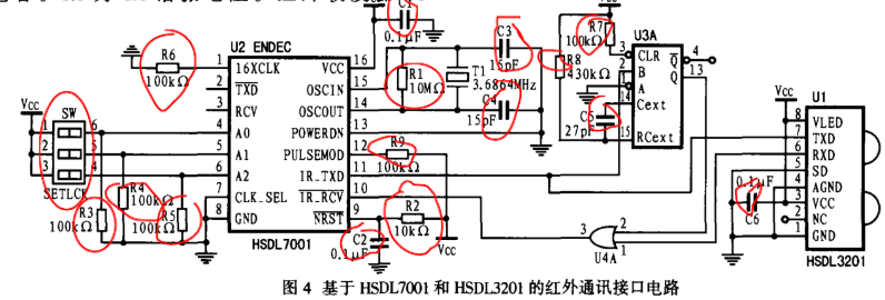 基于HSDL7001与HSDL3201的红外通讯接口电路如图4所示。其中TTL电平或COMS电平串行信号的发送与接收分别与U2HSDL7001?的引脚2、3相连。三路编码接U2的引脚4、5、6,用来设置通讯波特率。T1为3.6864MHz晶振。C3、C4为15pF谐振电容。R1为1M谐振电阻。红外收发器U1?HSDL3201?在每发送一字节数据的同时,会将该数据通过接收器数据输出(引脚6)反馈进行校验。这个校验码对于某些通讯系统来讲意义不大,因此可采用回馈码消除电路来消除回馈校验码。图中U3是单稳态多谐振荡器,与逻辑或门?U4?组合可达到消除回馈校验码的目的。在单片机系统中,可以在发送数据的同时将串口接收中断关闭,这样就可不受回馈校验码的影响。如果需要启用该回馈码来进行校验,则可不用U3、U4,而直接将U2的引脚10、11与U1的引脚6、7相连。
