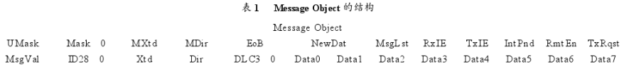 (2)信息目标(Message Object)接口寄存器:配置32个信息目标(Msg Obj),从目标接收和发送数据。8051处理器通过他来读写CAN Message RAM;