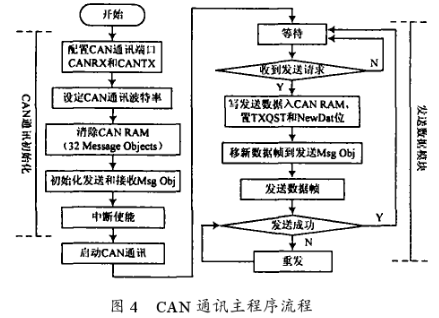 CAN通讯协议的最大特点之一就是废除了传统的站地址编码,而使用信息块标志码。ID28-0,Xtd和Dir用来定义信息标志码,以及定义即将发送数据帧的类型(远程帧或标准帧),并且与Mask28-0,MXtd和Mdir一起用来作为将要接收数据帧的过滤器。一个已接收到的信息被放在有效的(MsgVal=1)、具有匹配标志码的Message Object里。只有当Xtd=1时,远程帧才被放入Message Object,Xtd=0时,标准帧被放入Message Object。当多于一个的有效Message object与收到的信息匹配,则该条信息被放入号码最小的Message object里。Data0-Data7是8个数据字节。CAN通讯初始化和法数据帧的软件流程如图4所示。