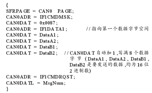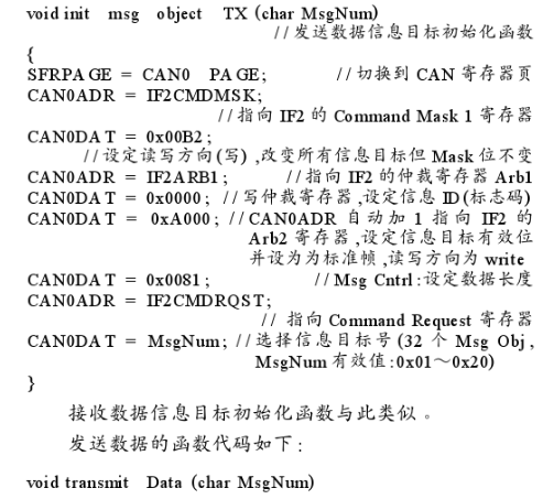 CAN通讯软件设计主要包括3个模块:CAN通讯初始化、接收数据和发送数据模块。信息目标的初始化程序代码(C语言)如下: