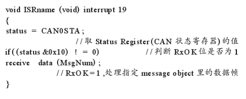 当微处理器接收数据采用中断方式,接收Message Object初始化时将RxIE位置1。当程序进入到CAN中断服务子程序时,先判断CAN状态寄存器的RxOK位是否已置位,若已置位,则说明CAN控制器已经成功接收到一个数据帧(因为CAN通讯有多个中断源,而中断向量只有一个),这时再调用相应的函数,取出数据帧中有用的字节进行处理或执行相应的操作。源程序代码如下: