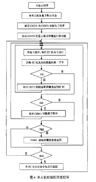 在整个方案中单片机控制程序的作用主要有:(1)当评估板上的按键按下时,CH451通过中断通知单片机,然后单片机从CH451的缓冲区中读取键码值,单片机再通过中断通知PC机,PC进入相应的中断程序进行处理;2)当PC发送命令时,CH371通过中断通知单片机,单片机对该命令做出响应,或控制CH451,或返回应答数据,流程图如图4所示。