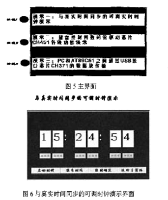 功能说明:在电路板上有三个按键,对应这三个按键有三个不同的演示程序。根据该界面的提示,每按下一个按键就进入相应的演示程序,而演示完一个程序后可以退回该界面进行另外演示程序的选择。 2)同步可调实时时钟演示程序