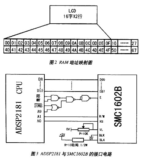 一般地,主控CPU与SMC1602B液晶模块的硬件接口有总线方式和模拟口线方式两种,这里,我们以ADSP2181作为主控CPU,使用总线接口方式,如图3所示。通过数据总线与控制总线,直接采用I/O设备访问形式控制该液晶显示模块。